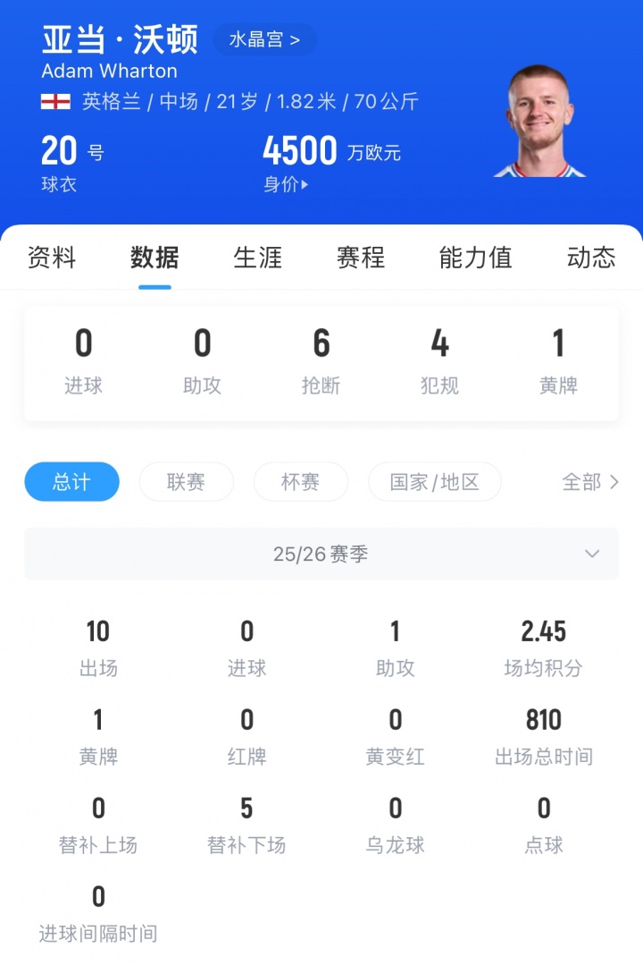 21岁的沃顿本赛季代表球队出场10次,贡献1助,目前德回转 价为4500万欧元。