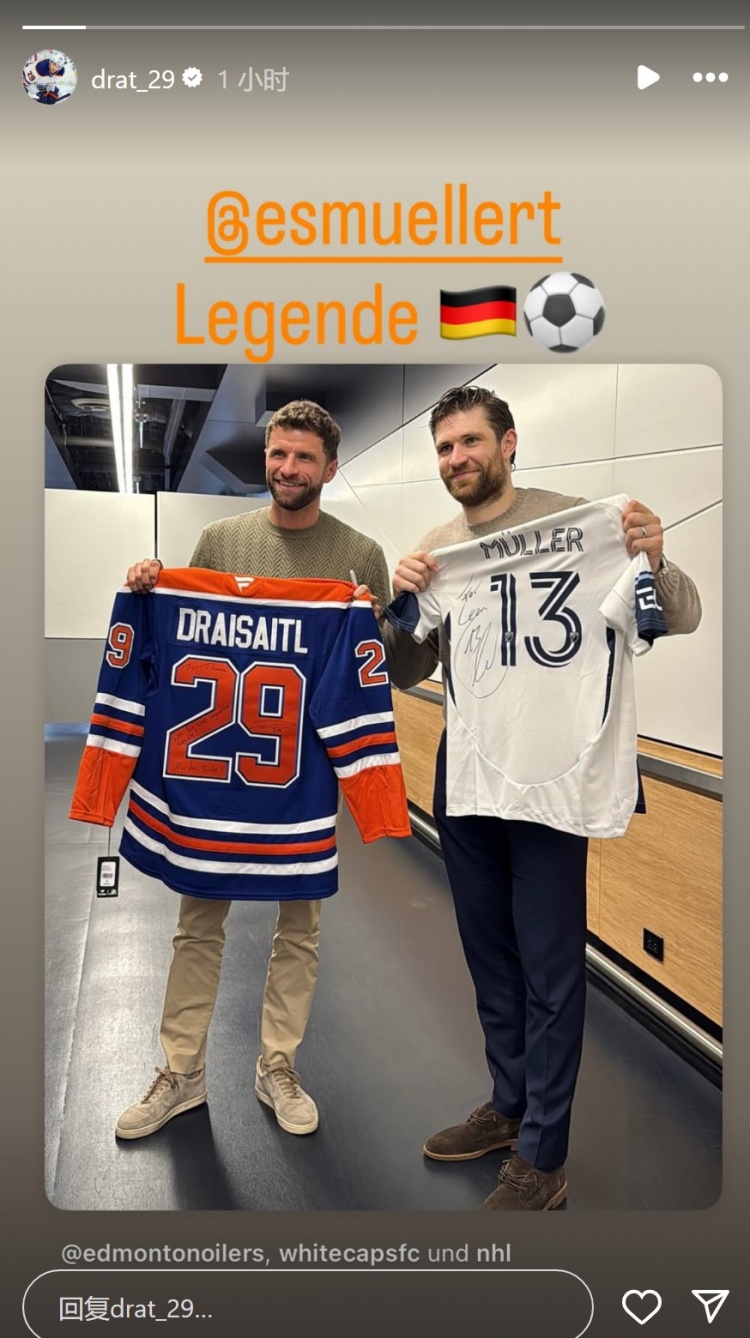 穆勒与德国冰上曲棍球 体育选手 德赖塞特尔交换运动活动 服 并合影,后者效力于NHL埃德蒙顿油人队,也是司职前场球员,欧洲杯直播两人社媒转发合照,并互称对方为传奇。